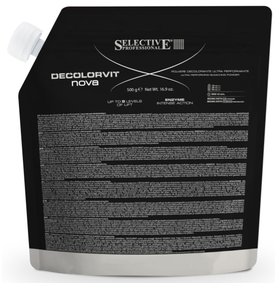 Decolorvit Nova, an ultra-performing bleaching powder, lifts up to 9 shades gradually and evenly when mixed with Decolorvit Active Use.